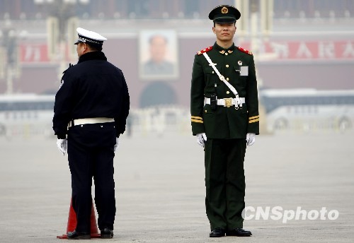 3月3日,全国政协十一届三次会议在北京人民大会堂开幕。天门广场上戒备升级。中新社发 杜洋 摄