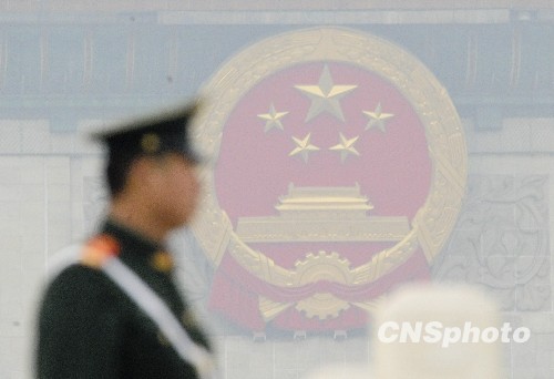 3月3日下午,全国政协十一届三次会议在北京人民大会堂开幕,武装警察在天安门广场执勤。中新社发 廖攀 摄