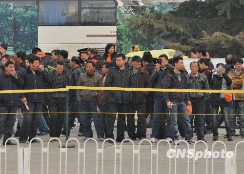 3月3日下午,许多民众聚集在北京天安门广场警戒线外,远远瞭望政协委员们进入人民大会堂参加全国政协十一届三次会议开幕式。中新社发 贾国荣 摄