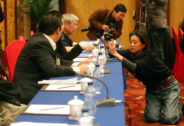 2010年3月4日,全国政协十一届三次会议文艺界别分组讨论。倪萍委员跪地为冯小刚等其他委员拍照。卢旭 摄