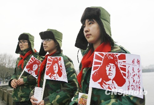 3月4日下午,中国美术学院青年志愿者协会的九名大学生头戴绿军帽,身穿迷彩服,脖系红领巾,手举“雷锋像”,走上杭州街头,用这样的行为艺术呼吁人们学习雷锋。中新社发 骆晓磊 摄