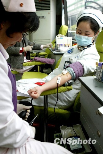 3月4日下午,由徐汇区卫生局主办的上海仁爱医院“学雷锋,百名白衣天使献血纠偏,热血传情活动”火热展开。近百名医务人员踏上流动采血车,在申城A型O型血液紧缺的关口,奉上“及时血”。近期,上海市青浦区一废品收购站突发火灾事件,为拯救8名伤者,上海血库告急。徐汇区血液管理办公室表示,目前申城血库A型、O型血源紧缺,并向辖区各单位广发英雄帖。上海仁爱医院积极响应徐汇区血液管理办公室号召,在院长施龙飞的积极呼吁下,近103名医护人员报名自愿参加无偿献血。中新社发 陈焕联 摄