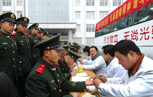 3月4日,武警安徽总队六安市支队邀请该市红十字中心血站将采血车开进警营,开展“弘扬雷锋精神,谱写爱民乐章”义务献血活动,100多名官兵义务献血达3万余毫升。中新社发 陈超平 摄