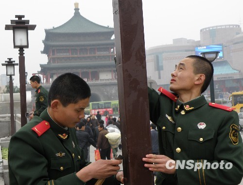3月4日,陕西省武警总队一支队的官兵们来到西安市主要街道、广场打扫卫生,清理“牛皮癣”,为城市“洗脸”, 并向市民宣传“做文明市民,创卫生城市”,以实际行动迎接3月5日“学雷锋日”的到来。中新社发 王振 摄
