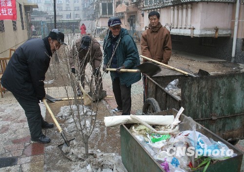 3月4日,老党员在小区内打扫卫生。在辽宁省葫芦岛市连山区活跃着百余位退休老党员志愿者,平均年龄近七十的他们常年无私地为群众做好事,博得群众的赞扬。中新社发 杨兵 摄