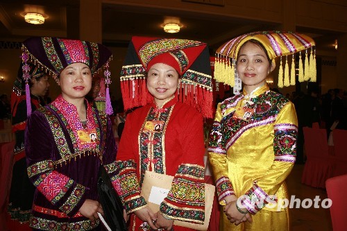 2010年3月5日,第十一届全国人大三次会议在北京开幕,广西人大代表王幼薇、王爱勤、向惠玲身穿少数民族服装亮相人大会议开幕式。 中新社发 金立冬 摄