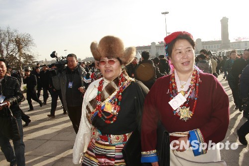 2010年3月5日上午9时,十一届全国人大三次会议在北京人民大会堂开幕。图为藏族女代表色珠、门巴族女代表白丹措姆出席会议。中新社发 金立冬 摄