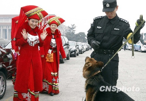 3月11日,参加十一届全国人大三次会议的全国人大代表,在北京人民大会堂听取最高人民法院、最高人民检察院报告。会场外,执勤的警犬吸引不少礼仪小姐的目光。中新社发 张宇 摄