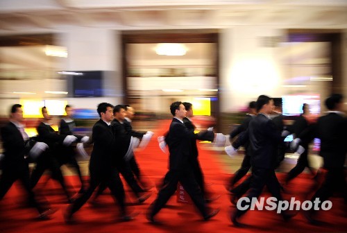 3月11日,十一届全国人大三次会议在人民大会堂举行第四次全体会议,听取最高人民法院和最高人民检察院工作报告。大会结束后,安保人员“风速”退场。中新社发 廖攀 摄