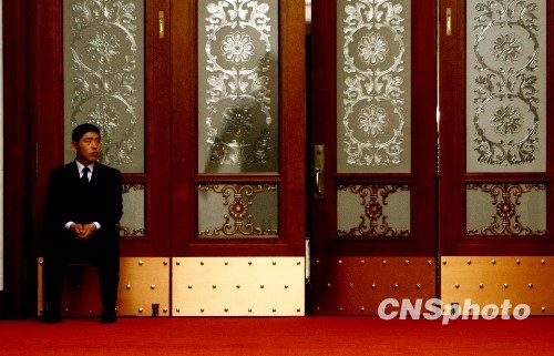 3月12日,北京人民大会堂正在召开全国两会,一名负责安保的警卫在门口值勤。中新社发 杜洋 摄