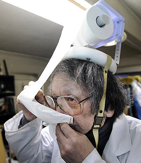 2009年6月,发明家川上贤司在日本东京演示安装在使用者头上的卷筒纸架。