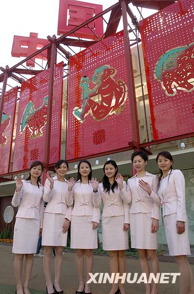 2005年3月25日,在日本爱知世博会中国展馆前,几位中国姑娘笑迎宾客。本届世博会中国展馆的主题为“自然、城市、和谐——生活的艺术”。它通过对中国文化的演绎,表达了“天人合一”的哲学思想,借助多种现代化技术和艺术形式,浓缩5000年文明和现代城市发展历程,展现自然与城市、传统与现代的和谐关系。马平摄