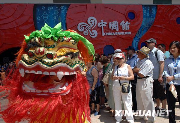 2008年7月1日,在西班牙萨拉戈萨世博会中国馆馆日活动上,中国的舞龙表演吸引着当地的观众。中国馆自开馆以来,每日接待观众超过1.5万人次。陈海通摄