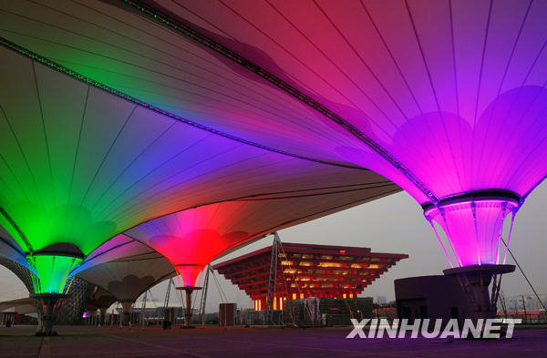 2010年1月7日拍摄的试灯中的上海世博园区世博轴索膜结构。当天,2010年上海世博会浦东园区的世博轴索膜结构试灯,变幻莫测的LED灯光映射在洁白的索膜结构上,上演了一场幻彩灯光秀。(蔡耀放 摄)