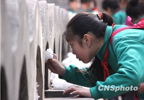 4月2日,河南省博爱县烈士陵园里,秀珠小学一名学生在向烈士纪念碑敬献鲜花。当天,该县团委组织2400多名师生到烈士陵园开展“怀感恩之情,承先烈遗志”清明节扫墓活动,深切缅怀在抗日战争和解放战争中英勇献身的革命烈士。中新社发 程全 摄