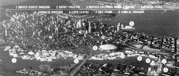 这是1986年5月拍摄的加拿大温哥华市鸟瞰图,海湾一侧一组新颖别致的建筑群是1986年世界博览会所在地。温哥华世界博览会的主题是“交通与运输”。