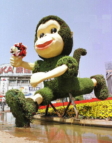 这是在1999年中国昆明世界园艺博览会期间,昆明百货大楼前的世博会吉祥物滇金丝猴“灵灵”的植物造型。昆明世博会于1999年5月1日至10月31日举办,其主题是“人与自然——迈向二十一世纪”,旨在实现人与自然的和谐相处。