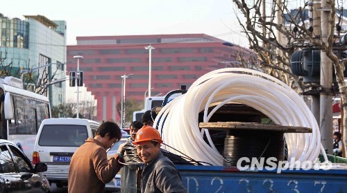 上海,中国馆前,工人在一辆装载建筑材料的货车前。 中新社发 井韦 摄