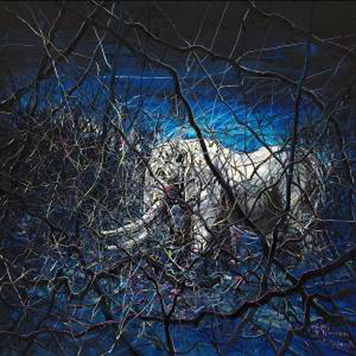 《太平有象》(作品尺幅为200×200cm)是曾梵志2008年以来创作的“太平有象”系列的延续,这一系列作品的特点是:在他独特的风景画面中,巧妙融入祥和而年轻的大象图案。据曾梵志透露,《太平有象》取义于陆游诗句“太平有象无人识,南陌东阡捣辄香”,以“喜象升平”,形容河清海晏,民康物阜。