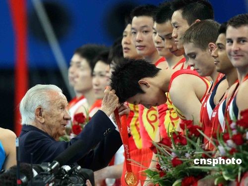 2008年8月12日上午10时,北京奥运会体操男子团体决赛在国家体育馆展开,中国男子体操队继悉尼奥运之后再次登顶,以286.125 分获得金牌,这也是本届奥运会体操赛场诞生的第一块金牌、中国奥运军团的第10块金牌。国际奥委会终生名誉主席萨马兰奇亲自为中国队颁奖。中新社发 任晨鸣 摄