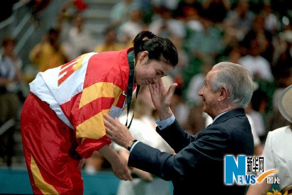 1996年7月31日,邓亚萍获得第26届奥运会乒乓球女子单打金牌后,时任国际奥委会主席的萨马兰奇亲自为她颁奖的资料照片。图片来源:新华网