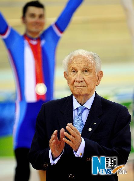 2008年9月9日,萨马兰奇出席北京2008年残奥会场地自行车男子1公里计时赛(LC2)颁奖典礼的资料照片。图片来源:新华网