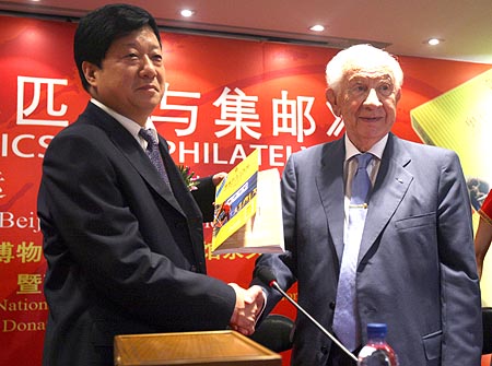 2007年6月24日,由《文明》杂志社出版、中国集邮总公司监制的“新北京·新奥运”系列珍藏特刊IV《奥林匹克与集邮》首发仪式在德胜文化中心举行。国际奥委会终身名誉主席萨马兰奇,国际奥委会委员、国际奥委会文化与奥林匹克教育委员会主席何振梁出席首发仪式并为该书作序。图片来源:北京奥运官方网站 张宇 摄