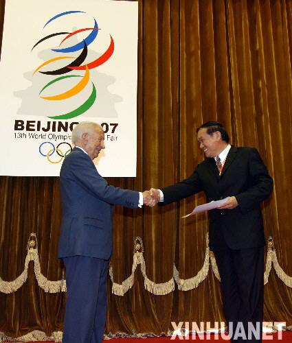 2007年6月24日,国际奥委会终身名誉主席、国际奥林匹克集邮纪念币纪念品委员会主席萨马兰奇(左)在颁奖典礼上为国家体育总局体育文化发展中心主任袁大任颁发特别奖。当日,第十三届世界奥林匹克收藏博览会颁奖典礼在北京举行。图片来源:新华网 孟永民 摄