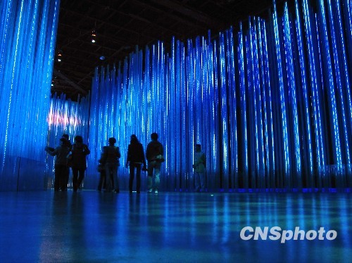 中国馆内的意象化植物,1000多根发光管材犹如竹子一般排列。 中新社发 井韦 摄