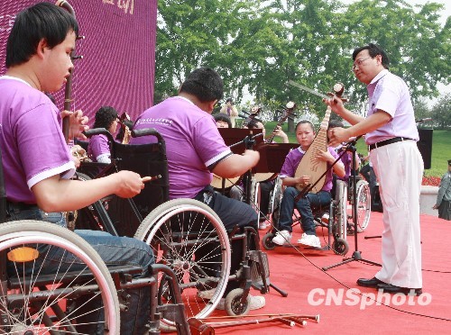 5月15日,在北京西单文化广场隆重举行了由中国残疾人联合会、中国残疾人福利基金会主办的第十二个全国助残日暨集善工程宣传活动。北科轮椅乐团现场表演了精彩的特殊艺术,团长兼指挥朱华现场表演口技并签售《大爱不到》一书,把所有款项捐给玉树地震灾区残疾人。图为残疾儿童进行二胡表演。中新社发 王超 摄