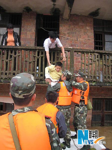 5月22日,武警江西新余市支队官兵在水北镇新桥村转移被洪水围困的群众。图片来源:新华网 陈开顺 摄