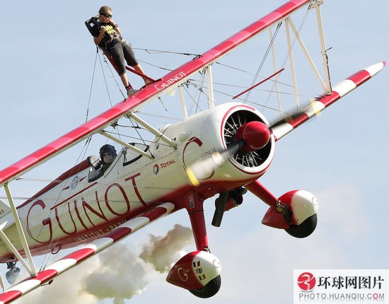 当地时间2009年8月19日,英国南部Cirencester,8岁的Tiger Brewer站在飞机的机翼上,这个飞机是他祖父的,他成为世界上年龄最小的机翼漫步者。SHAUN CURRY
