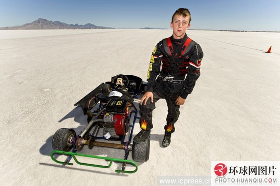 当地时间2009年9月17日,美国犹他州博纳维尔盐滩,来自密歇根的11岁赛车神童CORY COOTWARE,他已经7年赛车经验,之前在著名的博纳维尔盐滩比赛中创造了替代燃料卡丁车比赛纪录,时速高达94.151英里。他现在是六年级,请假一周参加这次比赛,这也是他第二次参加博纳维尔盐滩比赛。在2009年他参加了两次比赛,一次获得第一,一次获得第二,这次他希望能够成为美国汽车比赛协会的车手。