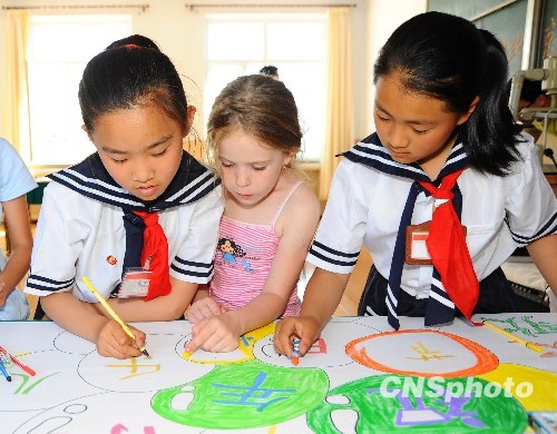 5月31日,黑龙江黑河市第三小学的师生与来自俄罗斯哈巴罗夫斯克市青少年艺术交流团的学生,开展系列联谊活动,共同欢庆“六一”国际儿童节。中新社发 邱齐龙 摄