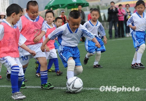 5月31日,辽宁大连市庆“六一” 第九届幼儿足球市级决赛在大连市奥林匹克广场西外场举行,来自获得各区选拔赛的12支小幼儿足球队进行角逐。中新社发 刘德斌 摄