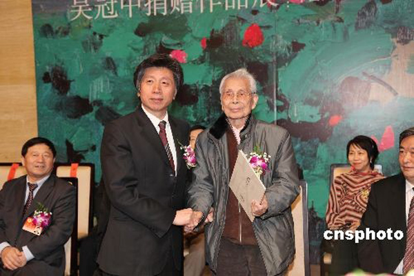 “耕耘与奉献--吴冠中捐赠作品展”于2009年2月26日上午在中国美术馆开幕。画展除展出吴冠中先生油画、水墨画之外,还结合相关艺术文献、图片和影像,力图全面而生动地呈现九十高龄的吴冠中先生从艺七十多年艰难探索的艺术历程,以及在中西方艺术融合、油画民族化和中国画现代化方面所做出的重要贡献。中新社发 王保胜 摄