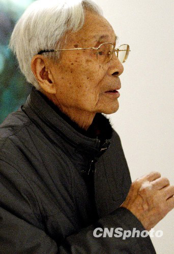 2010年3月4日, 由中国美术馆和朱德群工作组联合举办的“朱德群回顾展”在北京中国美术馆开幕。图为朱德群老同学著名画家吴冠中参观展览。中新社发 钱兴强 摄