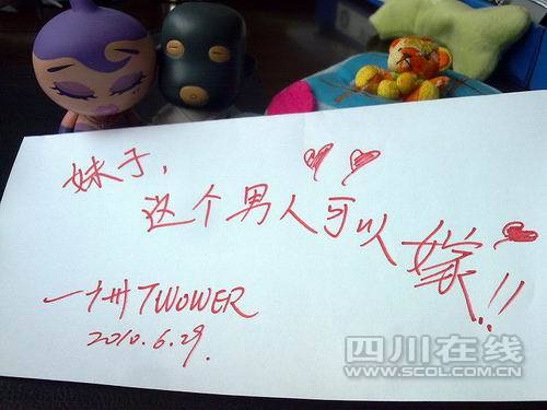 “你是不适合带回家的男人。”当贵阳网友“y8282908”在求婚时被女友拒绝后,他来到天涯请求网友帮忙:在各自所在的城市,写上一句求婚祝福,拍幅照片传给他,他要把照片制作成“中国求婚地图”!“求婚什马(即“么”字)的,最浪漫了!”这个求婚创意,把网友感动得一塌糊涂,截至昨日下午,“y8282908”已经收到来自60多个城市的100多幅照片。(宋建琴 柯述清)