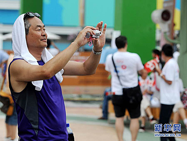 7月1日,一名头搭毛巾降温的游客在世博园内参观。燕雁 摄