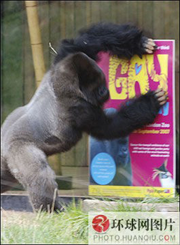 不喜欢同性恋海报的疯狂“女猩” 这只大猩猩在做什么?2007年9月,伦敦动物园的一只大猩猩在同性恋节日中,面对海报显得烦躁不安。这只雄性成年银背大猩猩,是动物园中的猩猩之王。工作人员当天把一张粉红色的“迎同性恋节日”的海报贴在它住处的围栏上。随后,它缓缓走到海报面前,奋力尝试要把海报撕下来。一位旁观者称,它当时表现得像一个疯狂的女人。