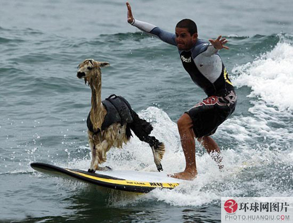 秘鲁训狗师训练“神兽”冲浪 2010年3月,秘鲁一位训狗师训练一头“神兽”——羊驼在海上冲浪,羊驼不仅不害怕,反而对激荡的浪花感到兴奋。突发奇想的羊驼主人将羊驼介绍给著名动物驯养师多明戈,让其教皮斯科冲浪。多明戈在位于秘鲁首都利马附近的太平洋让皮斯科进行了三次高达3米的海浪冲浪。皮斯科身穿救生服,当海浪过来时,它稳稳站在冲浪板上,不过几秒钟之后还是不小心掉进海水里。