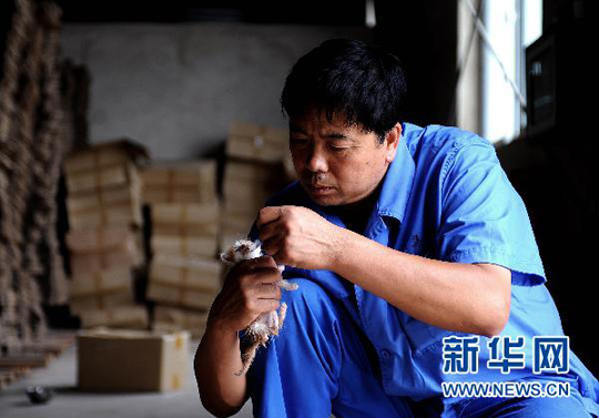 刘建国为一只生病的小猫喂药。姚剑锋 摄