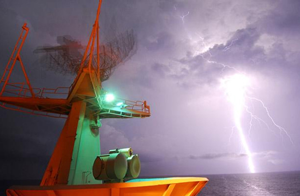 军事摄影师乔恩·胡斯曼和伊利奥特·法布里齐奥在美国“斯坦尼斯”号航空母舰上捕捉到这一道巨大的闪电。
