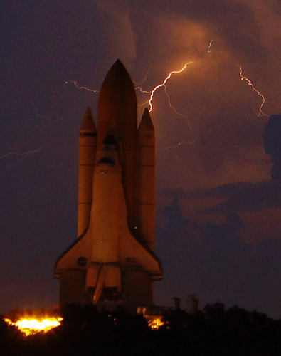 在美国佛罗里达州肯尼迪航天中心,“发现”号航天飞机即将发射。当时,两条闪电划过夜空。