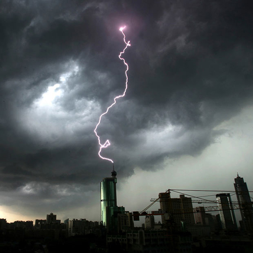 中国广东省佛山市,一道明亮的闪电划破夜空,直达一栋高层建筑的楼顶。楼顶上的避雷针有了用武之地。