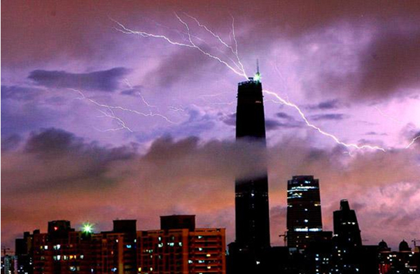 中国广州市,在一场暴风雨中,432米高的广州国际金融中心似乎和一道闪电实现了对接。(李杰)