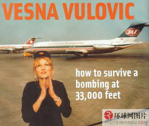 1972年,22岁的空姐维斯娜·沃洛维西从33000英尺高空飞速坠落,然而她的身上却没有降落伞包。塞尔维亚JAT航空公司JU367航班在飞越Srbska-Kamenice(现今捷克斯洛伐克境内)上空时遭遇恐怖分子的炸弹袭击(“克罗地亚国家运动”恐怖组织宣称,他们对沃洛维西之外的全部乘机人员的死亡负责)。然而与这次恐怖袭击同样令人震惊的是沃洛维西竟安然生还。从33000英尺高空坠落,她的颅骨、双腿和3节脊椎骨折而暂时瘫痪,但术后已恢复正常,仍继续着她的空姐工作。迄今为至她是自由落体生还的吉尼斯纪录保持者。