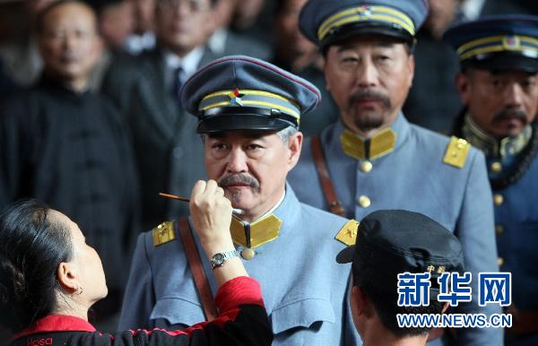 目前,电影《建党伟业》剧组已从北京转至天津。该影片因邀请了不少当红影视明星而备加引人关注。 图为10月5日,化妆师给在电影《建党伟业》中饰演段祺瑞的赵本山补妆。