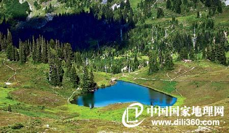 这是美国奥林匹克国家公园东部的一处景观,它位于公园之中那座海拔2400多米的奥林波斯山上。因为山地生态系统不同,山巅又有活动冰川覆盖,园区内就形成了以温带雨林、山区草地和海岸线为主的自然景观,灌木、野花以及蕨类和地衣随处可见,其间还分布着形状新奇的湖泊。