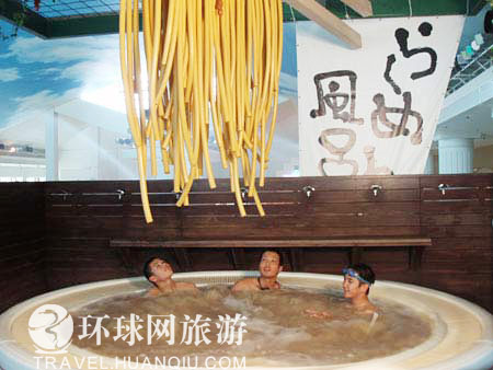 卡通里的樱桃小丸子时常天马行空,甚至梦见和美食一起游泳,而现在现实生活中真的有这样的事!日本温泉胜地箱根出现了全球第一个拉面温泉--游客泡的“汤”,不但弄得和碗里面喝的拉面高汤一模一样,池子还作成碗的造型,可说创意十足。该温泉位于日本富士山脚箱根小涌园温泉主题公园“悠内三”内,大家去箱根旅游时可以去尝试一下。